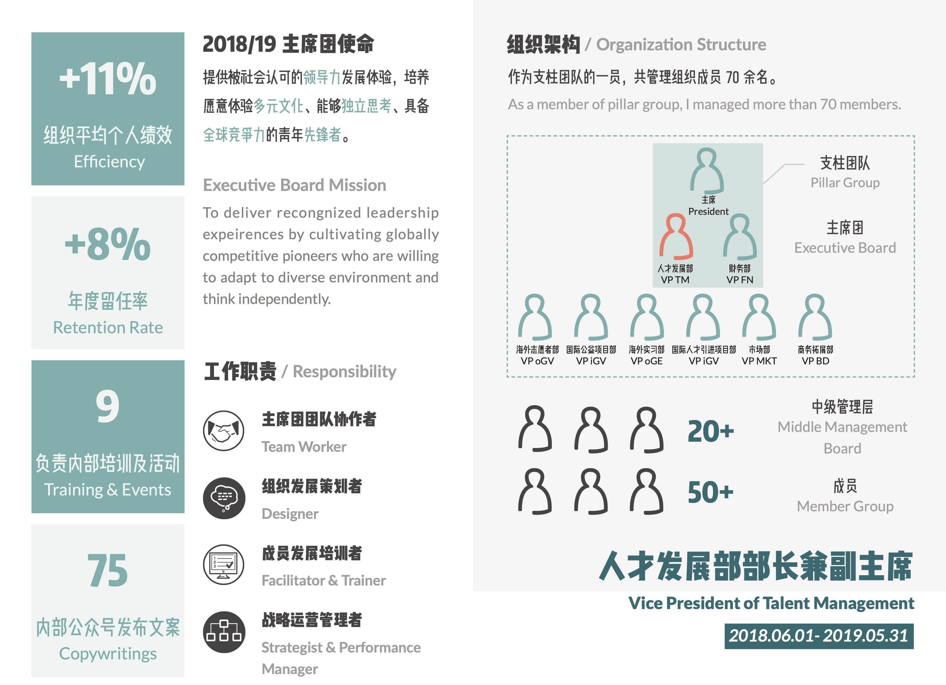 - 组织管理:完善并标准化团队招新与晋升流程;完善组织及各部门培训计划,负责举办10+场大型内部培训及活动,年度团队绩效提⾼11%;加强成员对组织的归属感与认同感,年度留任率提⾼8%;负责组织内部公众号运营,累计发表⽂章75篇